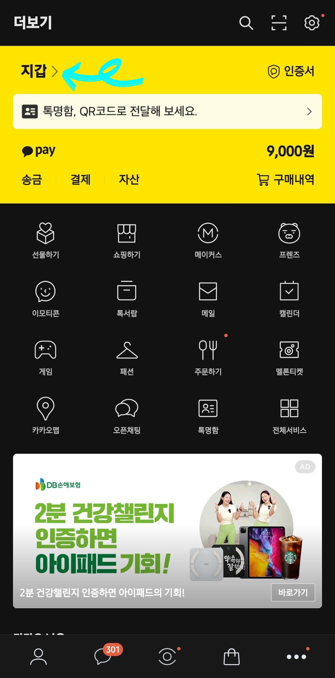 - 카카오톡 하단 오른쪽 끝에 점 세 개를 누른 후 "지갑"을 선택